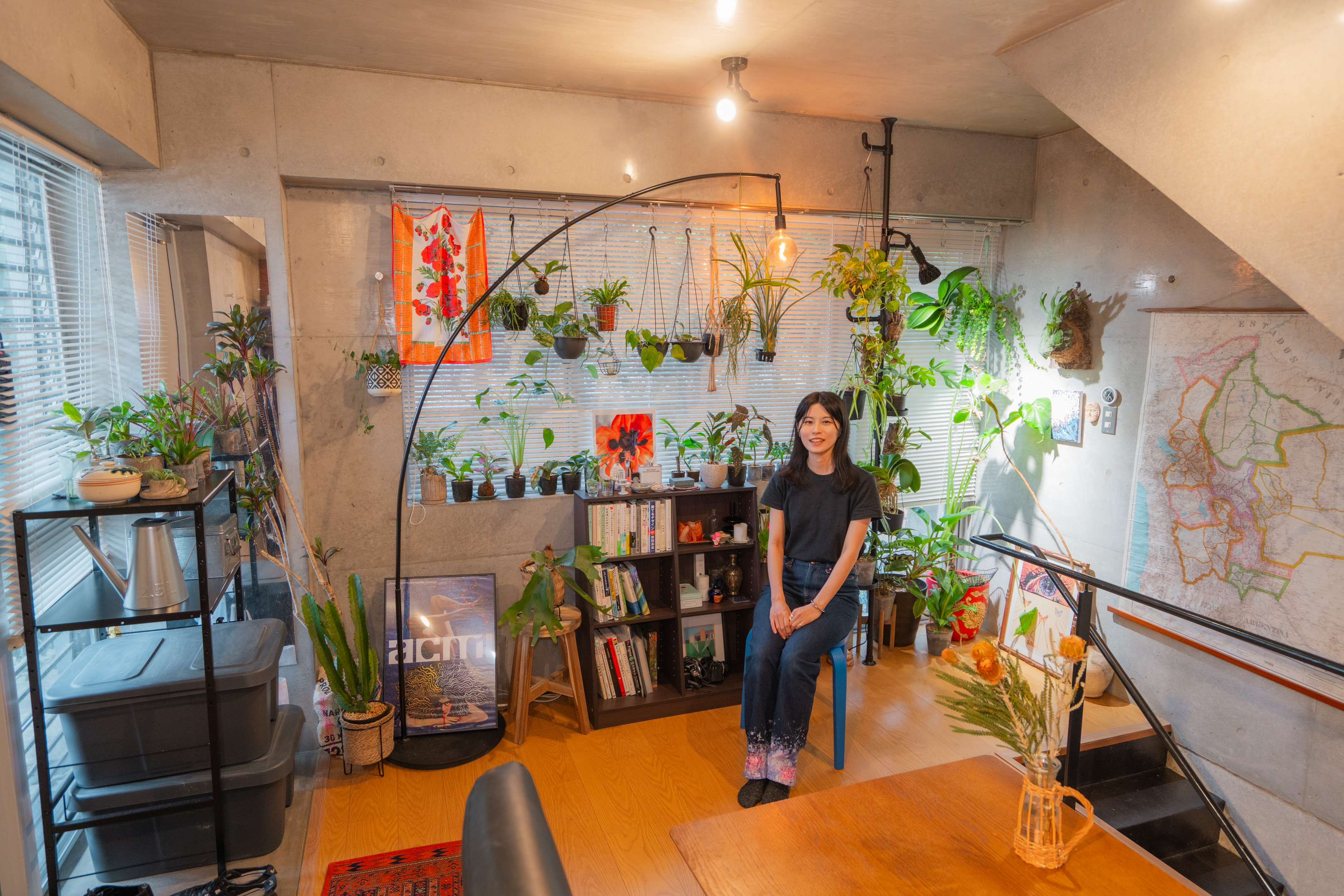 半地下コンクリートの家|デザイナーが暮らす沢山の観葉植物と民芸品に囲まれた暮らし|20代女性|1人暮らし